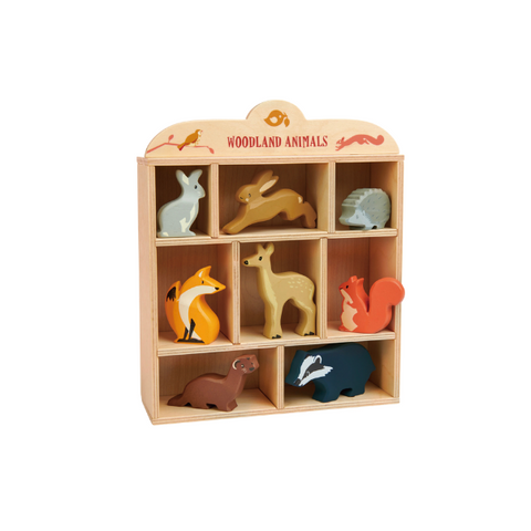 ESTANTE ORGANIZADOR DE MADERA CON COMPARTIMENTOS DE DISTINTOS TAMAÑOS QUE CORRESPONDEN A 8 ANIMALES DEL BOSQUE. LAS FIGURAS DE MADERA SÓLIDA, PINTADAS POR AMBOS LADOS Y CON AMIGABLES DISEÑOS INCLUYEN: UN CONEJO, UNA LIEBRE, UN ERIZO, UN ZORRO, UN VENADO, UNA ARDILLA ROJA, UNA COMADREJA Y UN TEJÓN