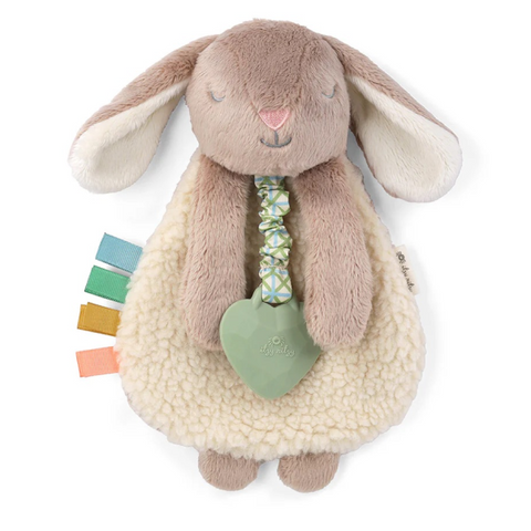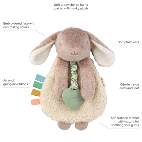 ¡Nuestra acogedora colección de juguetes Itzy Friends, Itzy Lovey™, presenta una suave tela sherpa y cintas texturizadas que al bebé le encantará explorar! Un mordedor de silicona texturizado ayuda a masajear y calmar las encías doloridas, y los brazos y piernas arrugados seguramente mantendrán al bebé entretenido con su suave sonido.