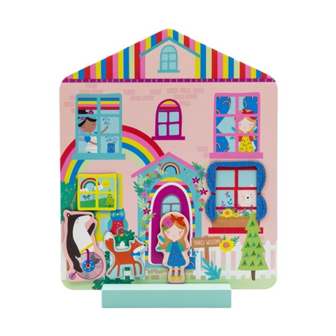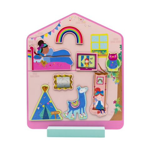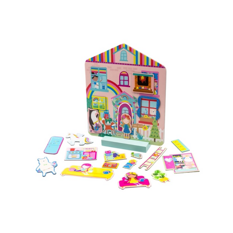 Entra y diviértete decorando nuestra propia casa magnética de hadas arcoíris; hay una casa magnética de doble cara con el exterior de la casa en un lado y el interior del otro. ¡con más de 40 piezas magnéticas, puedes jugar con qué poner donde y hacer adorables juegos de habitación! & nbsp; Para facilitar la decoración, también se incluye un soporte de madera para que pueda girarlo. todo esto contenido en una fabulosa caja de almacenamiento reutilizable que sostiene 2 cajones deslizantes para mantener todos los brocas y piezas almacenados de forma segura