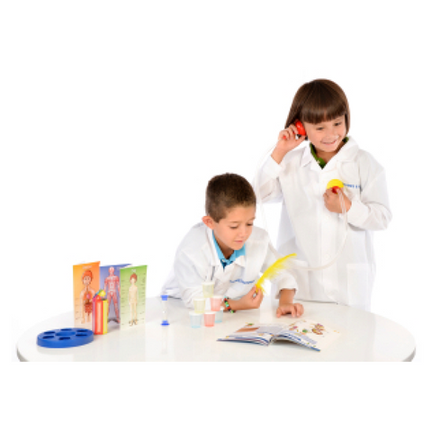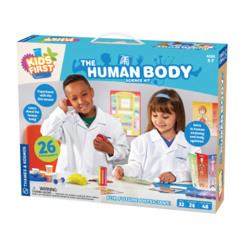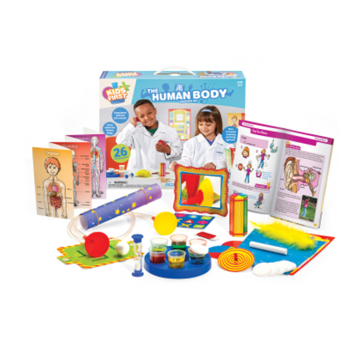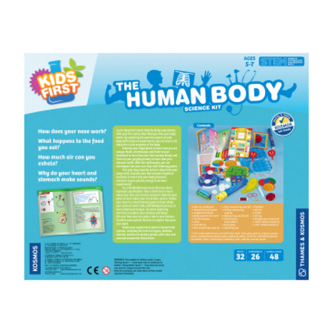 Aprenda sobre el cuerpo humano haciendo experimentos con sus cinco sentidos que le muestren cómo funciona su cuerpo. Al explorar los aspectos externos de su cuerpo con experimentos prácticos, puede aprender mucho sobre la anatomía interna del cuerpo. Examine sus huellas dactilares para saber cómo es único. Construya un estetoscopio y escuche los latidos de su corazón para aprender cómo su corazón bombea sangre, y escuche el gorgoteo de su estómago para aprender cómo funciona su estómago. Con el estetoscopio, puede investigar cómo escuchan sus oídos con un juego de escucha y un experimento de memoria de sonido. Pruebe su capacidad pulmonar para aprender cómo funcionan sus pulmones. ¡Examine su dieta y sus funciones digestivas para aprender cómo su cuerpo procesa los nutrientes para darle la energía para hacer más experimentos! Pruebe un ejercicio con los ojos vendados para aprender sobre la coordinación ojo-mano. Realice una prueba de cosquillas para conocer su piel y sus receptores sensoriales. Controle su pulso para aprender sobre su sistema circulatorio. Sigue tu olfato en un juego de memoria olfativa para aprender sobre tu sentido del olfato. Realice una prueba de sabor con los ojos vendados para aprender acerca de su lengua. Pruebe algunos ejercicios de equilibrio para explorar sus músculos y huesos. Descubra cómo sus oídos juegan un papel en su equilibrio. Construya un telescopio mágico, haga girar una peonza de ilusión óptica y realice un concurso de miradas para ver cómo funcionan sus ojos. Relacione sus experimentos con los sistemas del cuerpo humano, incluidos los órganos internos, el esqueleto, los músculos y el sistema circulatorio, con ilustraciones anatómicas claras y precisas. Con una guía ilustrada a todo color de 48 páginas, este kit enseña los fundamentos de la biología humana con experimentos prácticos paso a paso.