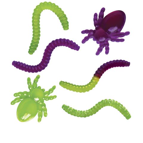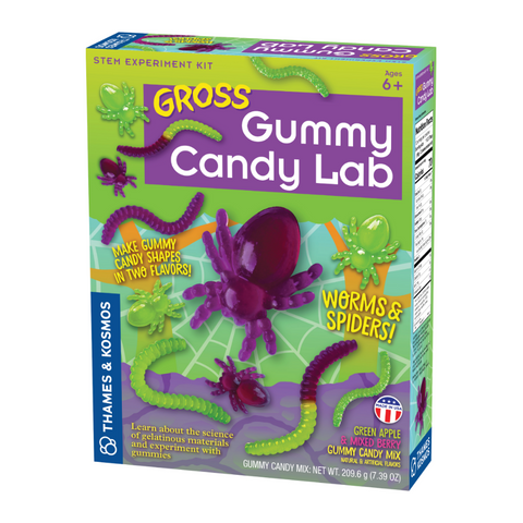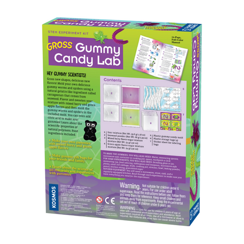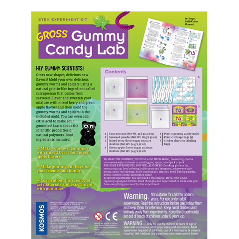 Moldea tus propias y deliciosas arañas y gusanos con un ingrediente natural similar a la gelatina llamado carragenina que proviene de las algas. Condimenta y endulce su mezcla con sabores mixtos de bayas y manzana verde y luego moldee los gusanos de goma y las arañas en el molde incluido. ¡Incluso puede agregar ácido cítrico para hacer gomitas agrias! Conozca las propiedades científicas de los polímeros naturales. Ingredientes alimenticios incluidos.
