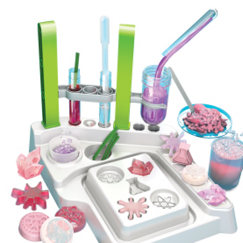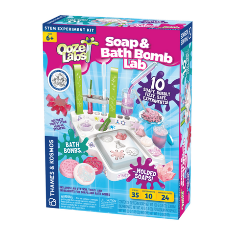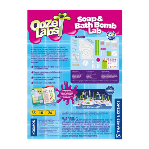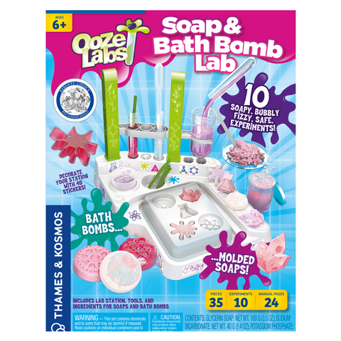 ¡Es hora de empezar a mezclar las cosas! En este supuesto escenario STEM, usted es químico de una empresa de productos para el cuerpo y el baño y es su trabajo fabricar y probar diferentes productos cosméticos. Utilice las herramientas de su laboratorio para emplear diferentes técnicas científicas y principios químicos esenciales para hacer jabones y bombas de baño. Pruebe diferentes aditivos para afectar el color, el olor y otras cualidades de los productos que fabrica. La ciencia real y el juego de simulación se unen en este kit lleno de actividades que se puede usar solo o como una extensión de la estación de química de Ooze Labs (¡un ganador de honor de plata de Parents Choice!). A medida que moldea diferentes formas de jabón de glicerina, aprende sobre las propiedades químicas del jabón que lo ayudan a recoger y eliminar la suciedad. Mientras prepara bombas de baño, aprende cómo se combinan los ácidos y las bases para formar reacciones efervescentes y qué es el nivel de pH. Amplíe sus conocimientos sobre cosmética con una descripción general de la biología del cuidado de la piel y otras ciencias relacionadas con el jabón y los productos de baño. Todos los materiales y productos químicos no son tóxicos.