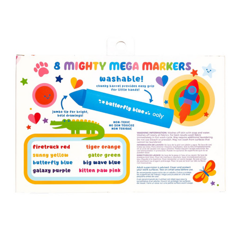 Estos 8 rotuladores de colores brillantes, lavables, los Mighty Mega Markers, son gruesos y fáciles de sostener para las manos pequeñas. La punta puntiaguda en forma de triángulo permite dibujar líneas finas y gruesas para el joven creador.